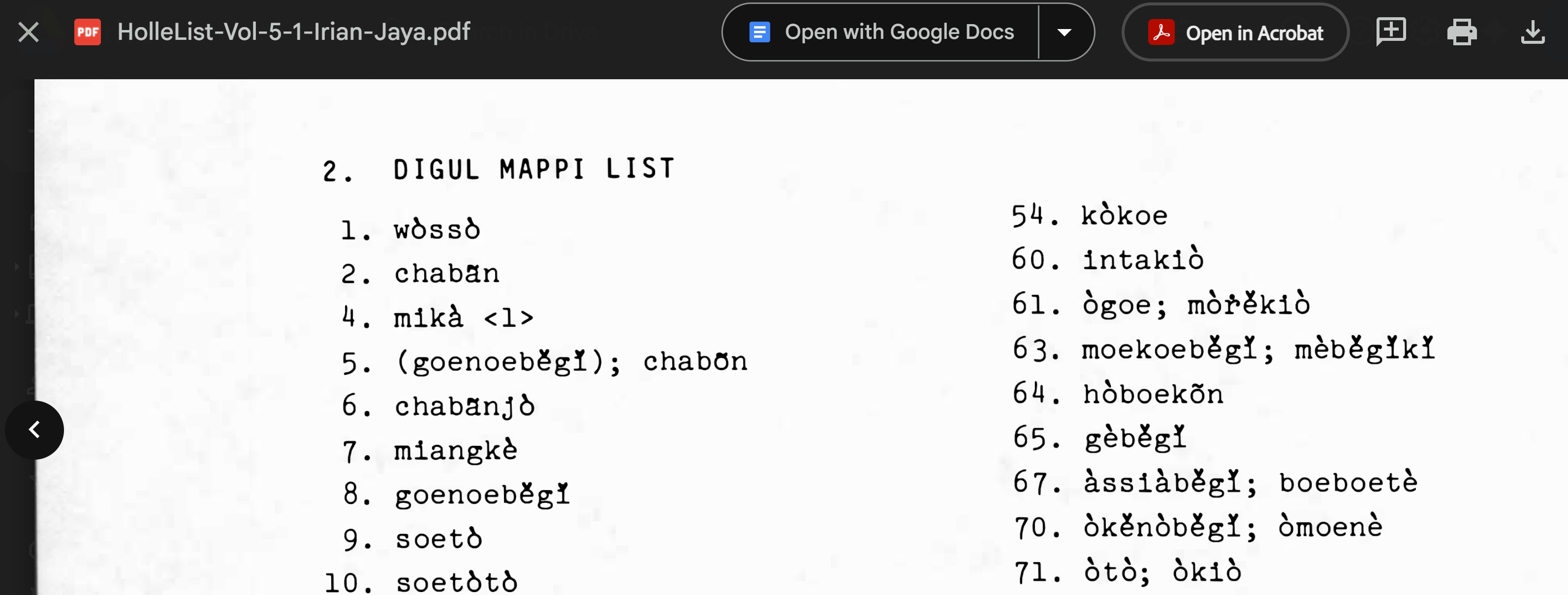 This section presents two sets of results from a single Holle List volume, namely vol. 5/1 (Stokhof et al., 1982) for Austronesian and Papuan languages in the Digul area, Irian Jaya (West Papua), Indonesia. They were chosen to illustrate differences in the quality of the conversion output, depending on the nature of the input characters in the source PDF file. These two sets represent two different languages in that volume, namely Numfor (Stokhof et al., 1982, p. 17) and Digul Mappi (spoken in the area between the Digul River and the Mappi River) (Stokhof et al., 1982, p. 133).