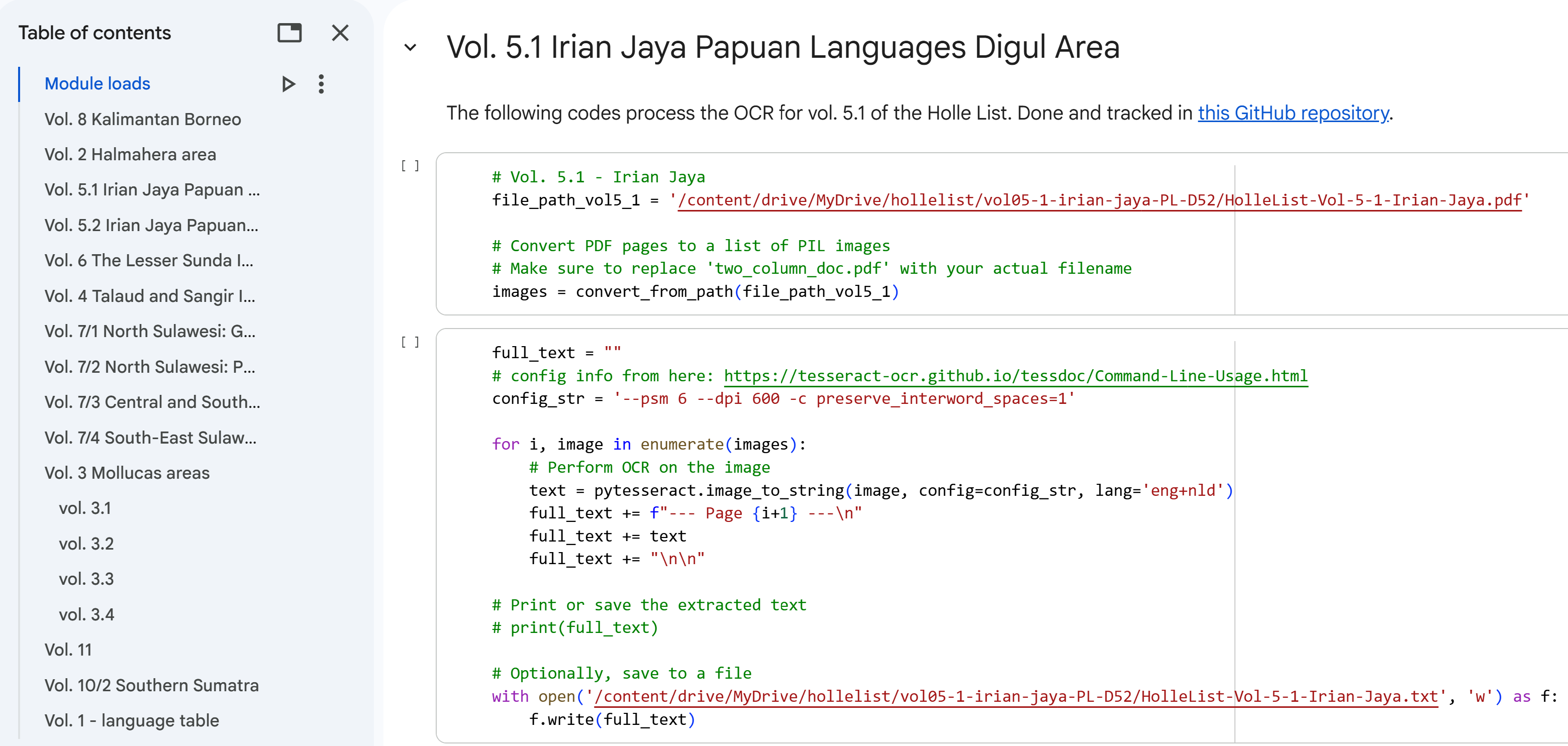 The PDF file for every volume was downloaded and uploaded onto the Google Drive of the Holle List project so that it can be accessed during processing in the Google Colab coding environment. This is explained next.