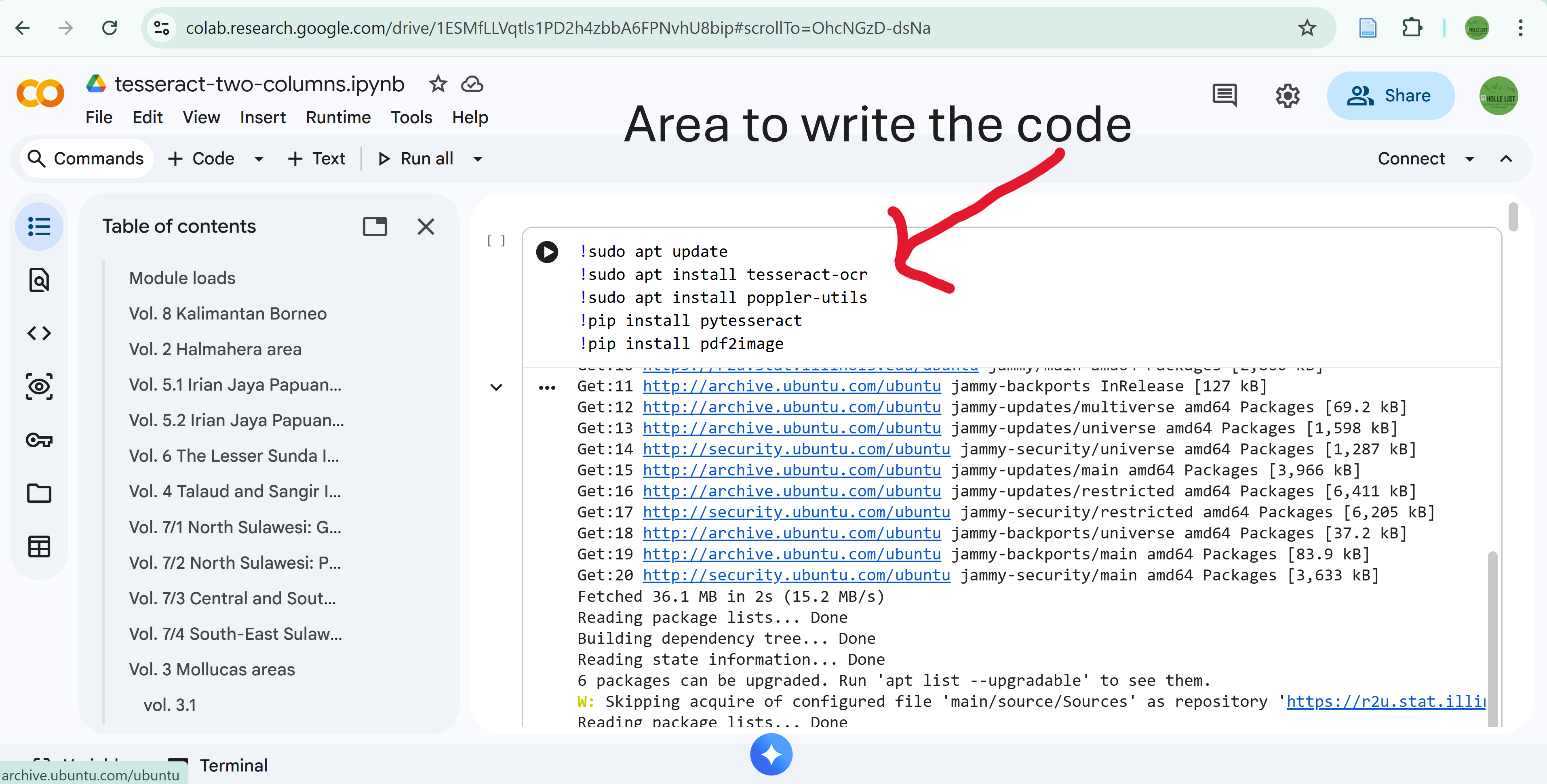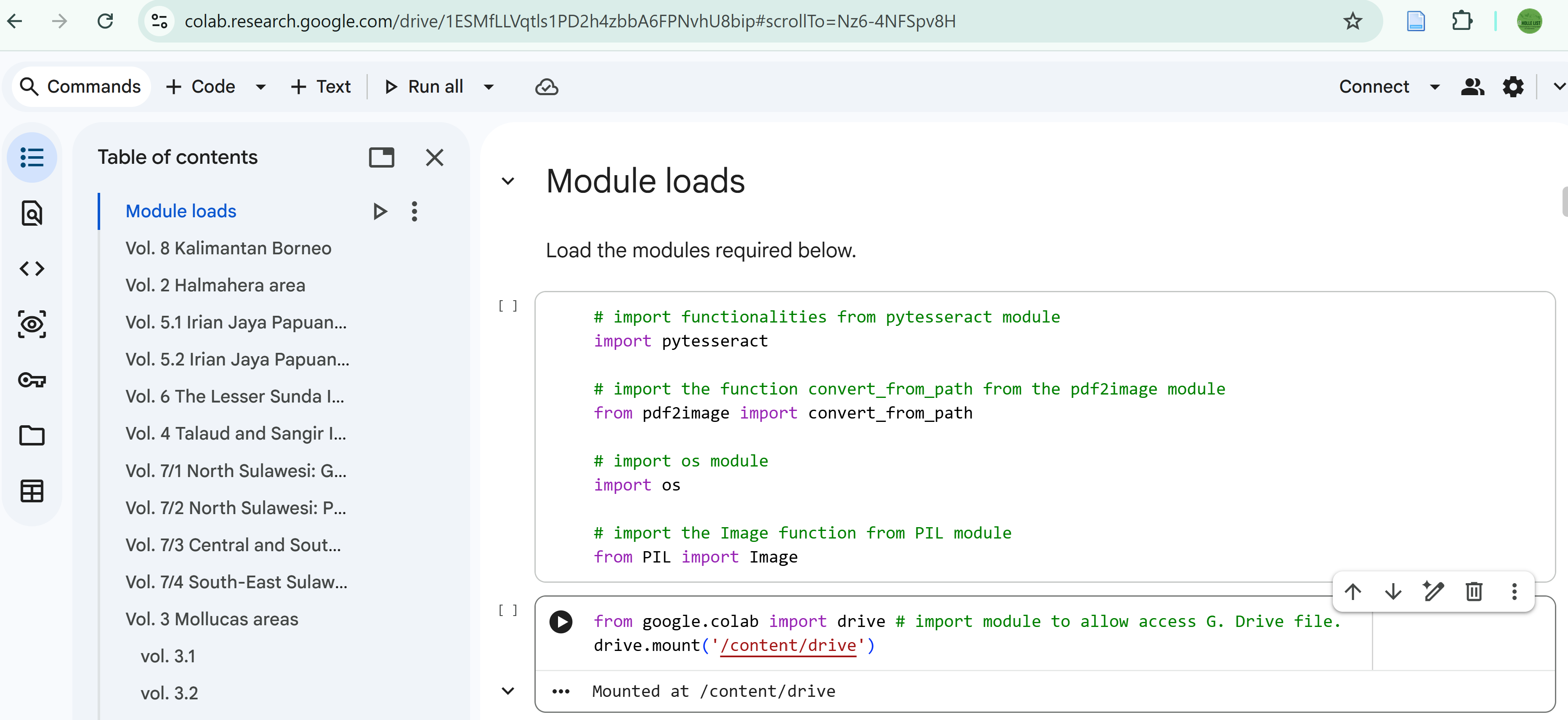 After that come the codes in the lower code block/box in Figure 5. They cover three aspects. First, setting up the parameters or configuration for the output format of the plain text. Details can be found at https://tesseract-ocr.github.io/tessdoc/Command-Line-Usage.html. Second, creating the main processing iteration to convert the images into a single text file. This is shown from the code line containing for i, image in enumerate(images): up until the line stating full_text += "\n\n". Finally, saving the output into a plain text file; this file is stored on a Google Drive folder specified by the user. The code line shown in Figure 5 indicates that the output is saved with the file name HolleList-Vol-5-1-Irian-Jaya.txt under a folder for the Vol. 5/1, which is in turn inside the hollelist sub-folder in my main Google Drive folder (MyDrive) (see Figure 6).