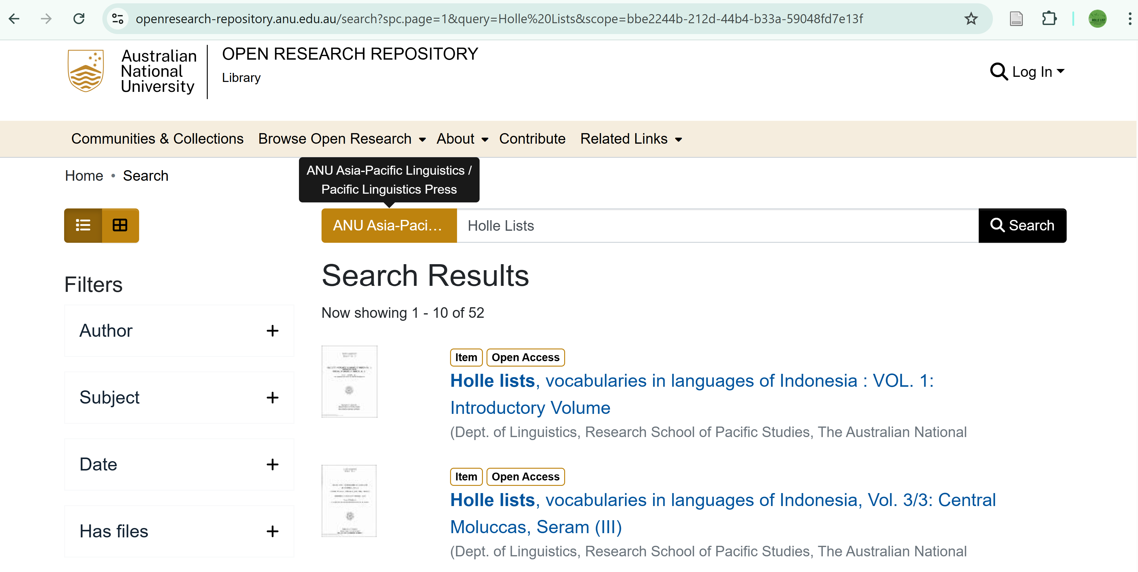 The PDF files for all eleven volumes of the Holle List series are available as open access on the Open Research Repository of the Australian National University (ANU) library, under the “ANU Asia-Pacific Linguistics/Pacific Linguistics Press” collection. The Holle List publications can be looked up using “Holle Lists” as the search term (see Figure 2).