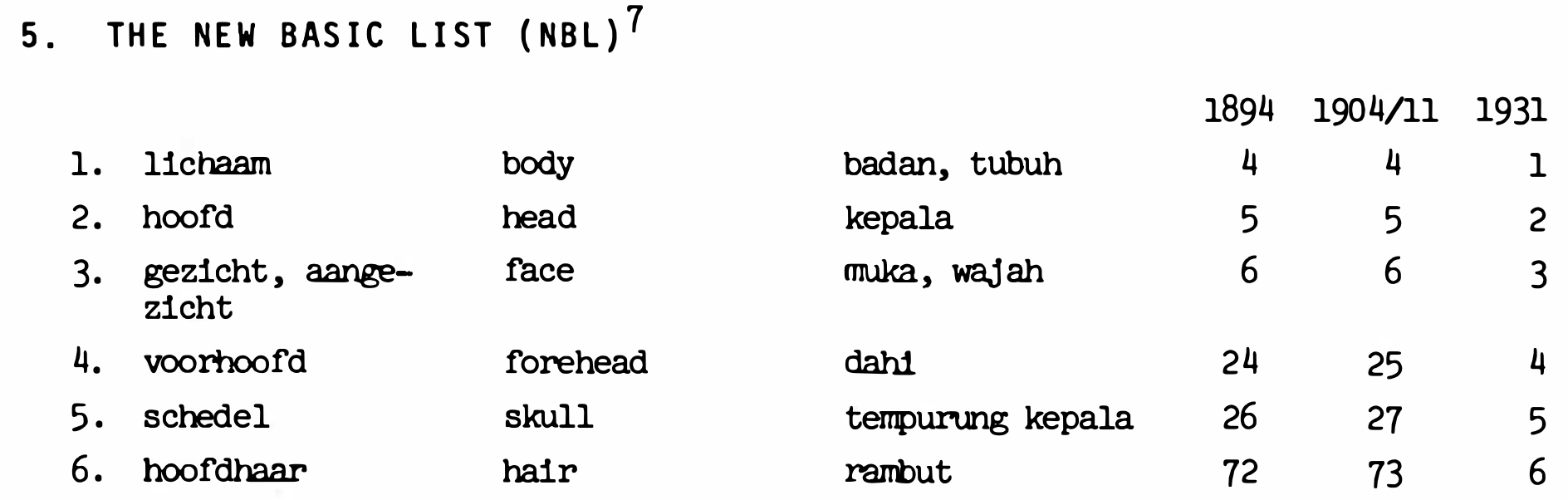 Consider the Enggano word èbaka (ID number 3 in Figure 1 (b)). To understand what the word refers to in Dutch, English, and Indonesian/Malay, one must look up the ID number 3 in the separate NBL publication (Figure 1 (a)). In this case, èbaka in Enggano refers to ‘gezicht, aangezicht’ in Dutch, ‘face’ in English, and ‘muka, wajah’ in Indonesian/Malay. Alternatively, from the perspective of the NBL, linguists could have asked how a given concept is lexicalised in a given language. For example, the concept of ‘lichaam’ or ‘body’ in English (and ‘badan, tubuh’ in Indonesian) (ID number 1 in the NBL) can be lexicalised by two forms in Enggano, as shown by those given for the ID number 1 in the Enggano list, viz. kărāhā and koedŏdŏkŏ (cf. Table 3 and Table 4).