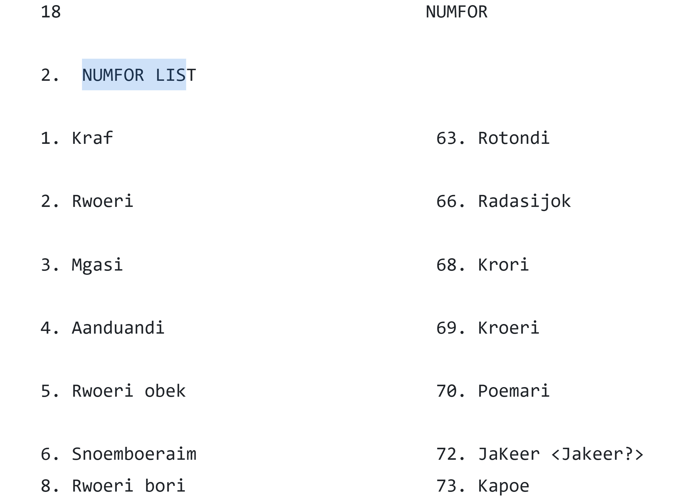 Careful inspection of the result snippets in Figure 8 and Figure 9 reveal differences in output quality. The words shown for Numfor consist of standard alphabetic characters without diacritics. The OCR output for these words appears correct and closely resembles the source PDF without the need to edit them. In addition, the index numbers are rendered correctly.